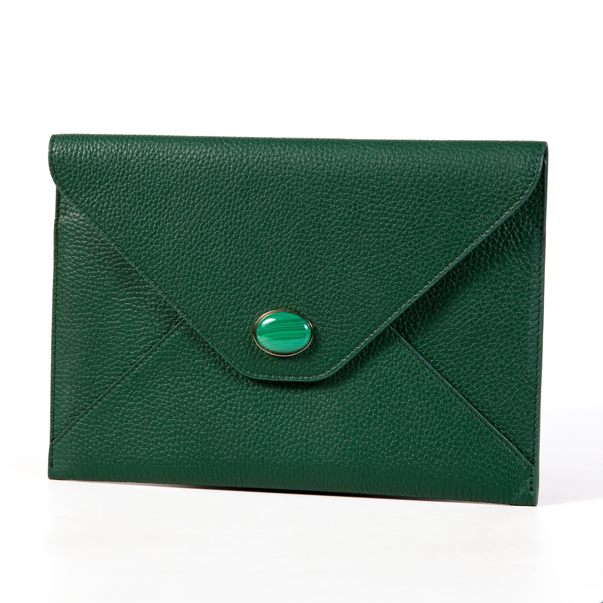 A signature piece from Madame Malachite’s collection, this envelope clutch is sealed with her kiss and lined with her signature green malachite lining.