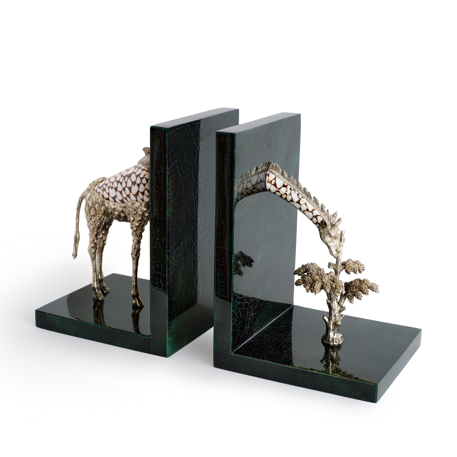 Meticulously hand-finished, the unique pair of Giraffe Bookends embody refined artistry and organic inspiration. A perfect balance of sculptural form and function, this duo elevates a library or a desk. Each piece rests on a lacquered shell base, merging nature-inspired design with luxurious craftsmanship.