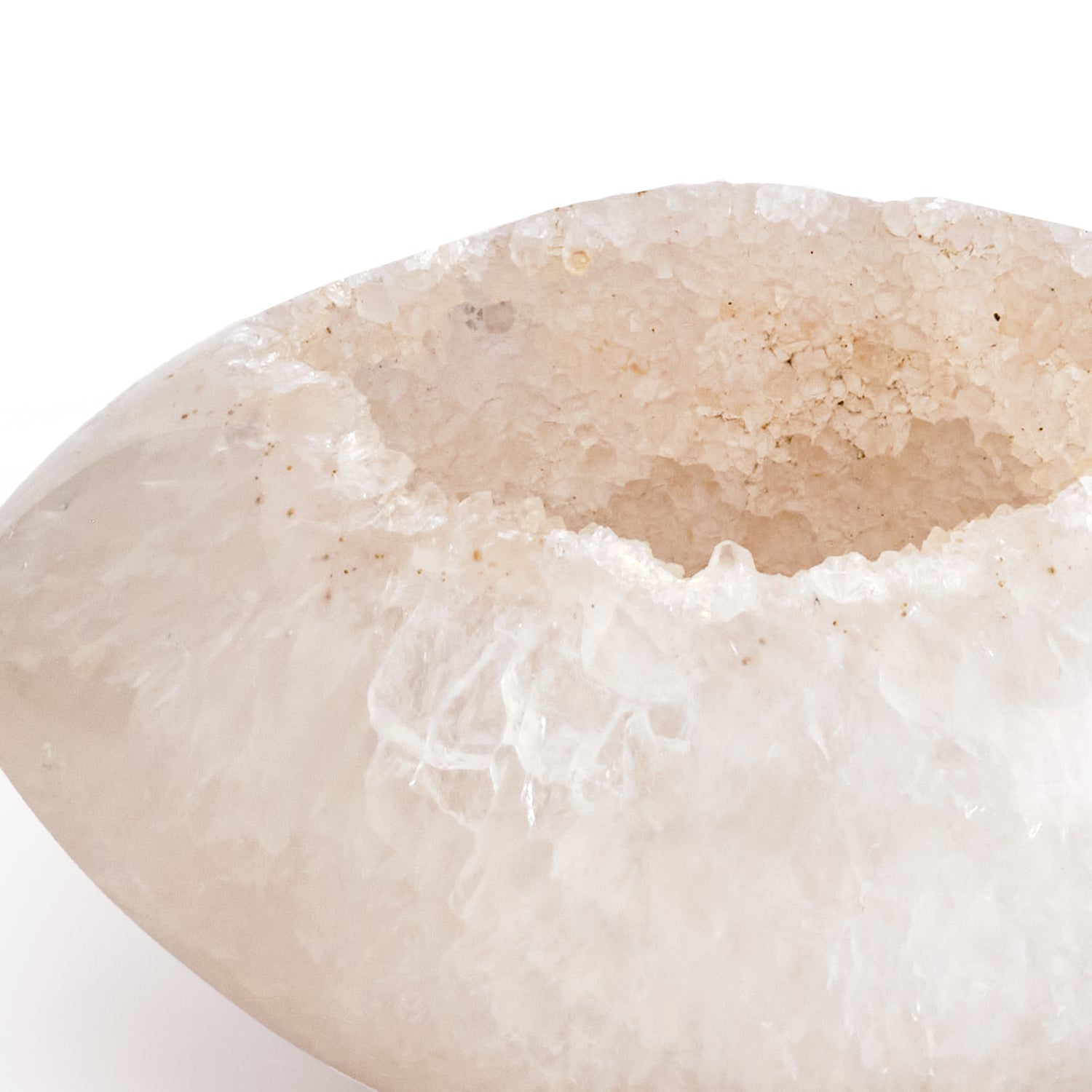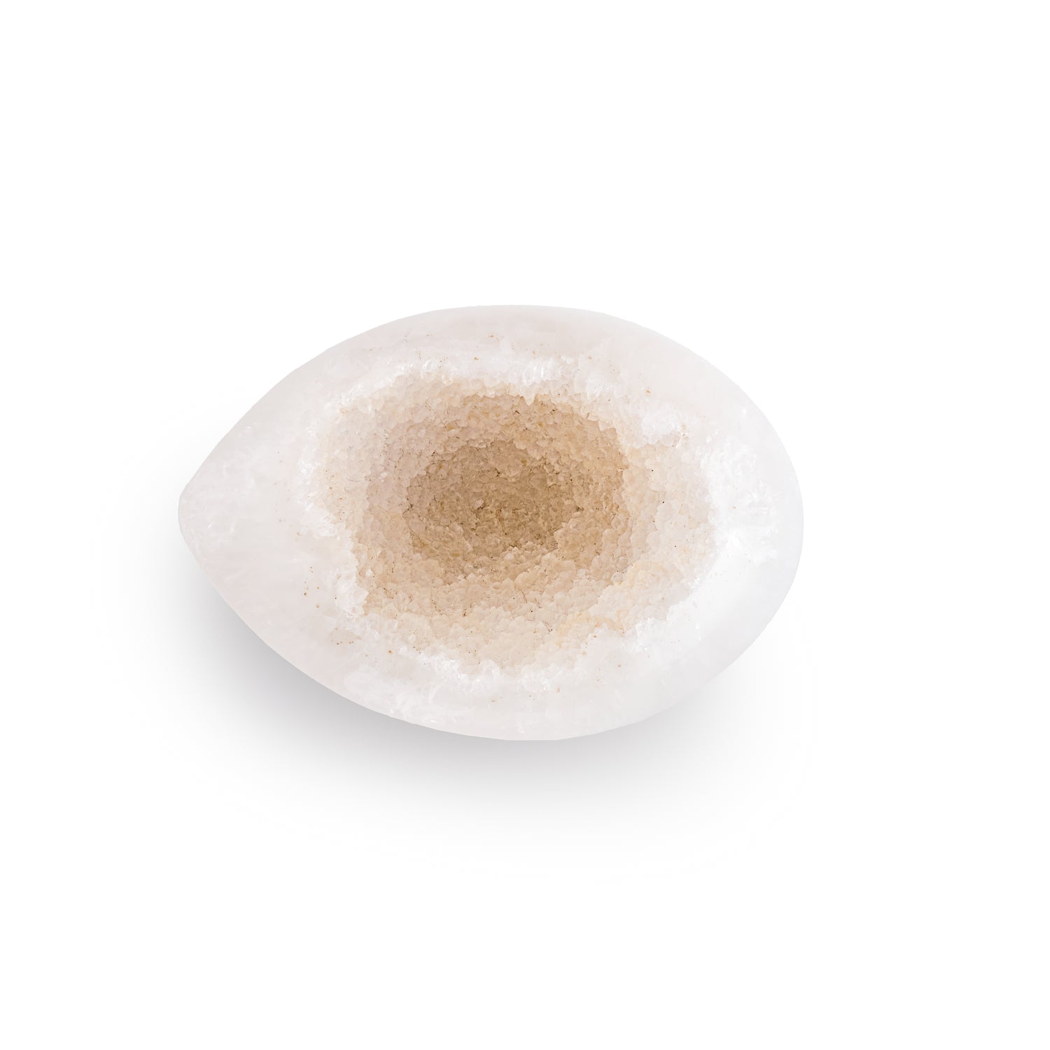 Hand-polished and naturally radiant, this small quartz crystal egg reveals a luminous geode interior , a serene accent that enhances calm and elegance in any space.